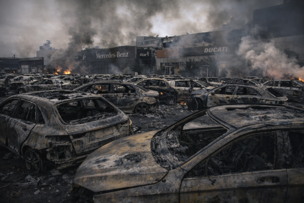 Коли палають автосалони, це вже не просто новина про бізнес — це чергове нагадування, що війна нищить цивільний простір у самому серці великого міста.