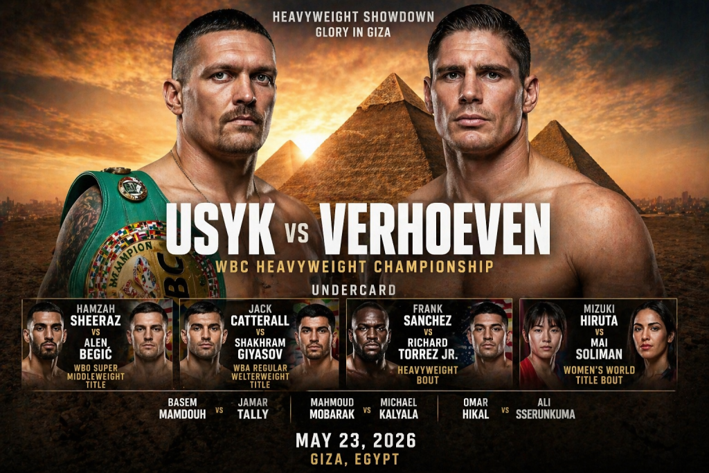 Вечір боксу Usyk vs Verhoeven: Glory in Giza вже встиг стати однією з найбільш обговорюваних подій весни 2026 року. У головному бою шоу, яке заплановане на 23 травня в Гізі, Єгипет, Олександр Усик проведе добровільний захист титулу WBC у надважкій вазі проти титулованого кікбоксера Ріко Верховена. Сам факт цього поєдинку вже підтверджений у статусі дивізіону WBC, а повний андеркард оприлюднили профільні боксерські медіа. Про це повідомляє InfoOnline.
