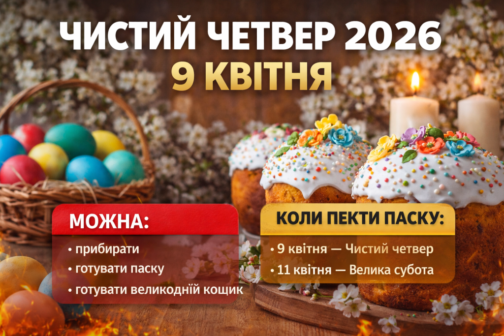 У 2026 році Чистий четвер буде 9 квітня. Це день, коли вдома можна прибирати, прати, готувати святкові страви й пекти паску, а найзручнішими днями для випікання великодньої паски є 9 квітня і 11 квітня, Велика субота. Але головне — пам’ятати, що Чистий четвер у церковній традиції є Великим четвергом, днем Таємної вечері, тому в центрі має залишатися не лише чиста оселя, а й внутрішній спокій перед Великоднем