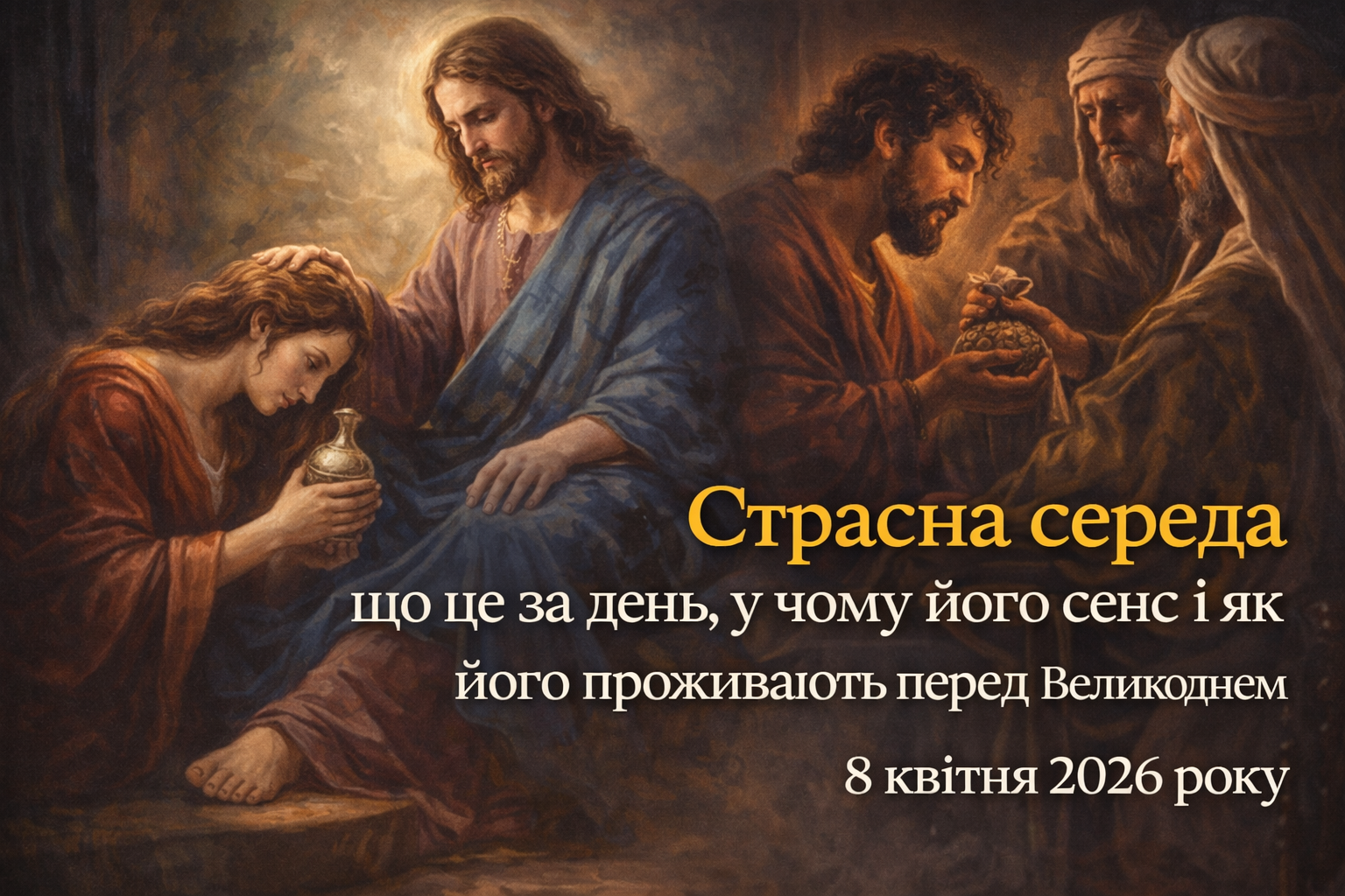 Страсна середа — це один із найглибших днів Страсного тижня, хоча в побуті його часто недооцінюють. Саме цього дня християни згадують і зраду Юди, і щедрий вчинок жінки, яка намастила Христа миром. У 2026 році Велика середа припадає на 8 квітня, і її сенс — у зосередженні, молитві, чесному погляді на себе і внутрішній підготовці до найважливіших днів перед Великоднем.